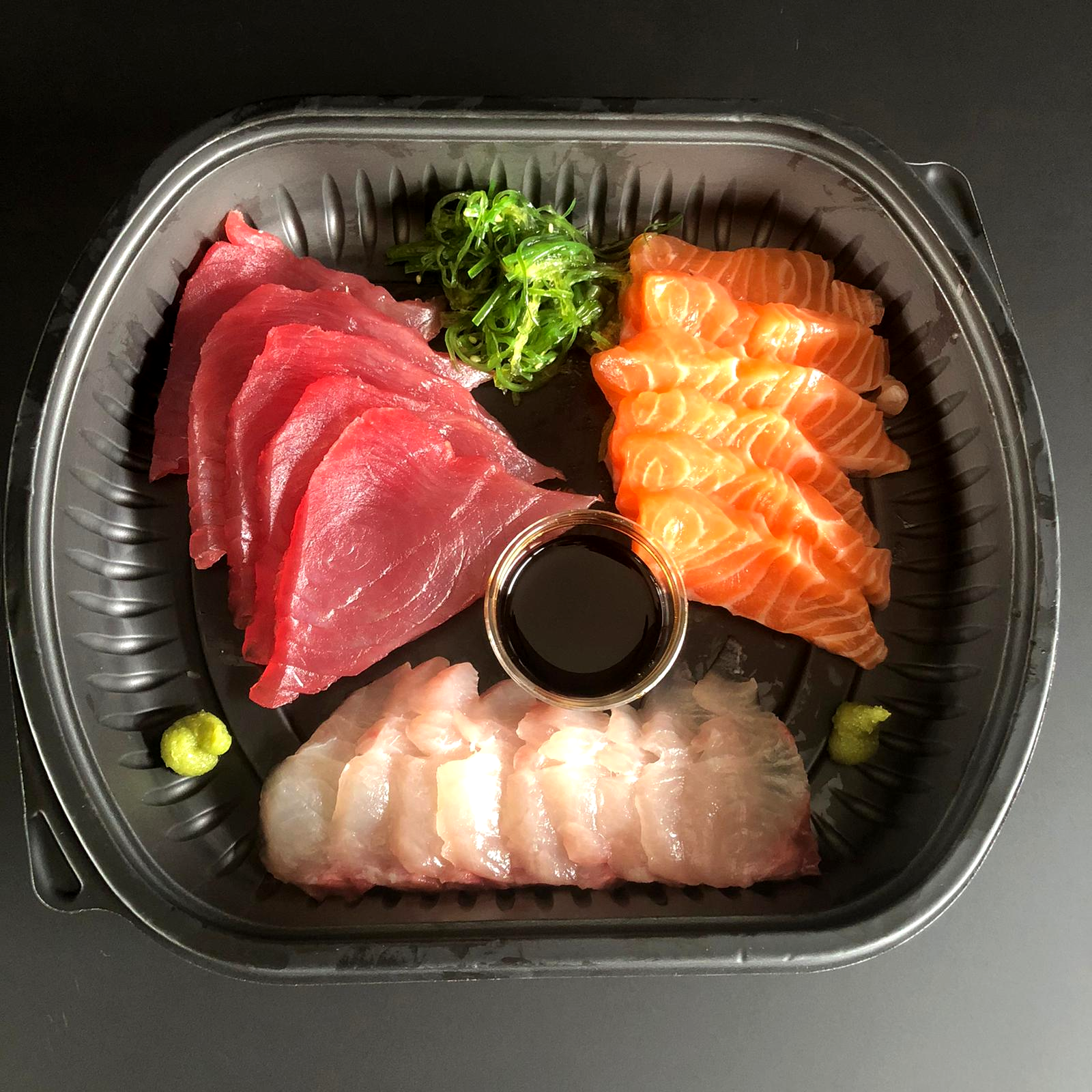 Pakket met verse gamba's, garnalen, tonijn en zalm.
